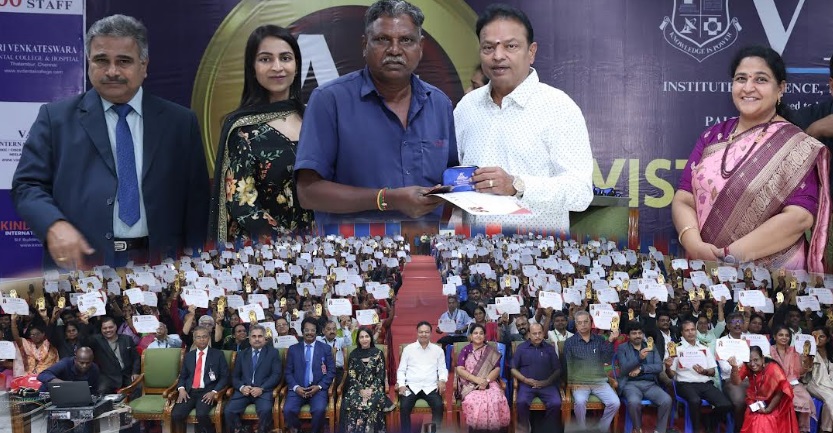 Dr. Ishari K. Ganesh, Founder Chancellor of VISTAS distributes gifts to employees in recognition of their outstanding contribution to achieving NAAC A++ accreditation
